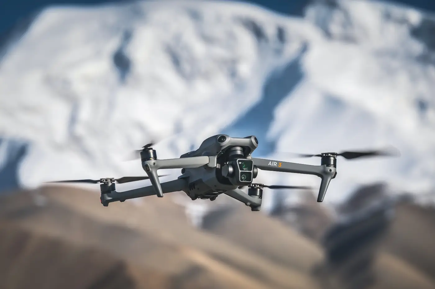 De DJI Air 3, een nieuwe toevoeging aan de Air-serie met dubbele primaire camera's. De Air 3 is voorzien van een groothoekcamera en een 3x medium tele camera.